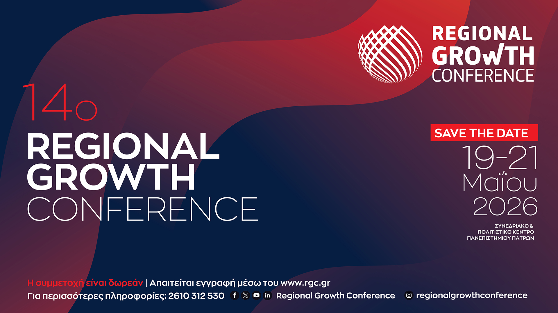 The Regional Growth Conference (RGC) serves as a public platform for dialogue between governmental, regional, academic and business representatives. Its main goal is to address challenges, best practices and policies promoted by European Institutions that need to be implemented in the Regional Development in an effort to bring forward the necessary regional governance model for Greece.